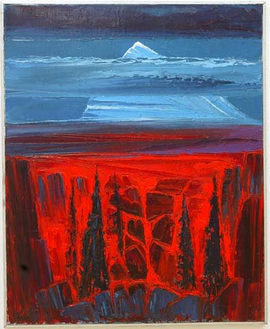 Röd ravin mot blåfjäll (olja 80x65 cm)