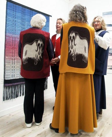 Västar i vadmal med myskoxe från jaquardvävd filt infälld i ryggen.